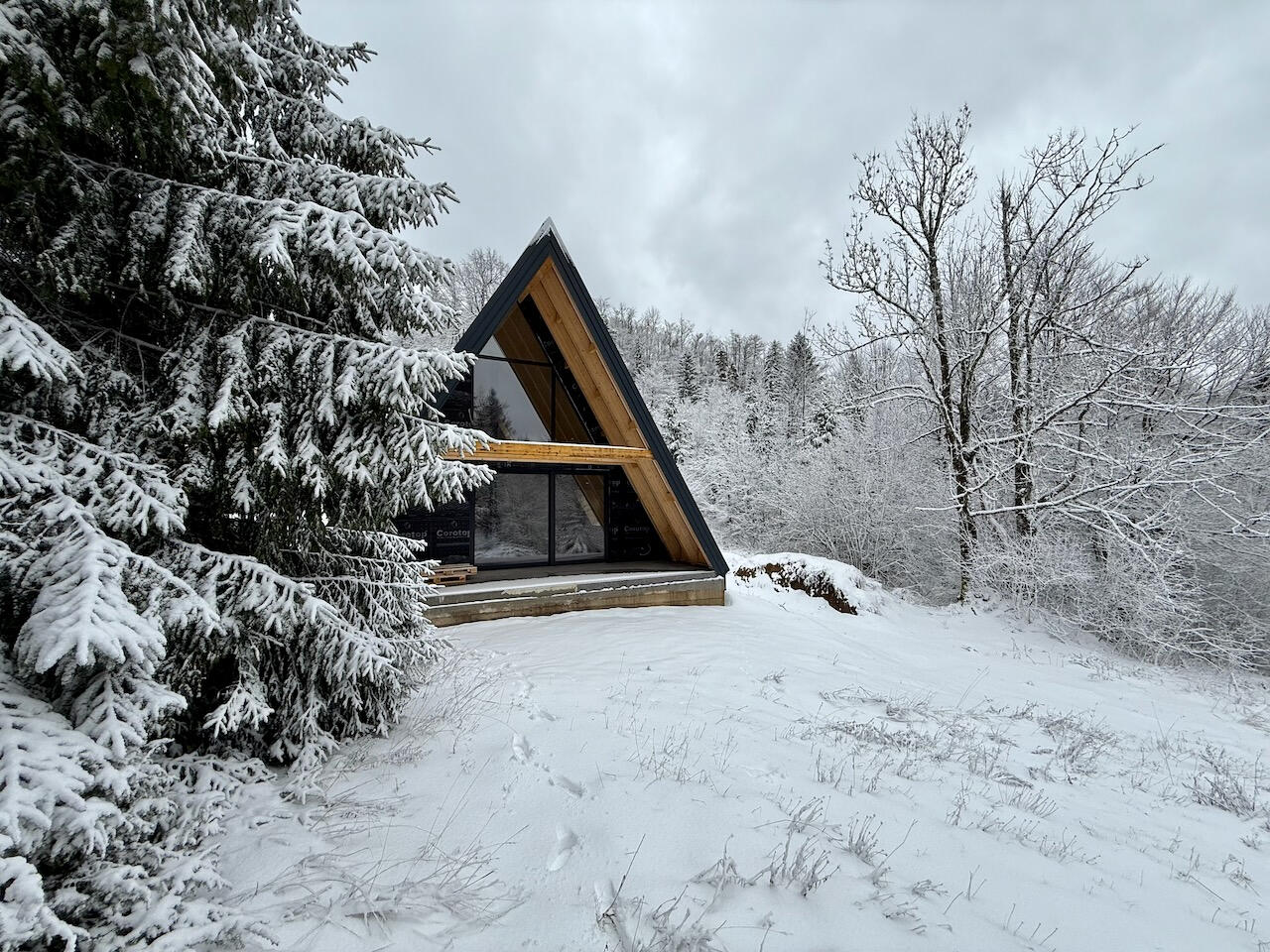 Redefinirana A-frame arhitektura predstavlja i prvi primjer takve arhitekture izvedene u CLT (cross laminated timber) tehnologiji u Hrvatskoj. Rezultat je spoj napredne drvene konstrukcije i suvremenog dizajna.Ove jedinstvene planinske kuće oblikovane su kao prozračni, svjetlom ispunjeni volumeni. Velike južne staklene stijene brišu granicu između gotovo osam metara visokog interijera i šume.Unutrašnjost je u potpunosti od punog drva koje istodobno nosi konstrukciju i oblikuje završnu površinu zidova i stropova.Kuće uspješno funkcioniraju na dvije razine – kao planinska utočišta koja karakterizira mir i spokoj, te kao suvremeni dom koji pruža sve udobnosti modernog života.