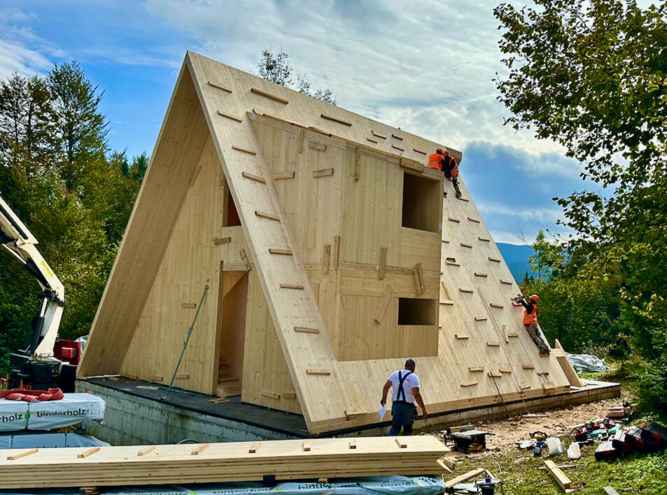 CLT je moderan građevinski materijal izrađen od višeslojnih, međusobno okomitih ploča smreke, koje se lijepe prirodnim, netoksičnim ljepilima.U usporedbi s klasičnim A-frame kućama, CLT konstrukcija donosi brojne prednosti: