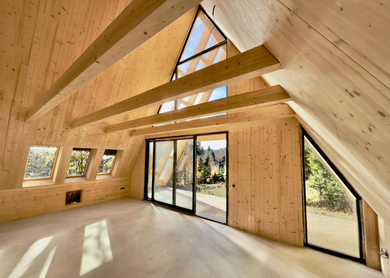Unutrašnjost kuće izvedena je od punog drva, koje ujedno čini nosivu konstrukciju i završnu površinu zidova i stropova - bez dodatnih obloga, brodskog poda ili letvi. Takav pristup stvara topao, autentičan i vizualno čist prostor, u kojem prirodna tekstura drva daje posebnu atmosferu.Središnji prostor čini otvoreni dnevni dio - kuhinja, blagovaonica i boravak - s visinom od gotovo osam metara i velikim južnim staklenim stijenama koje otvaraju pogled na šumu i unose obilje prirodnog svjetla.Kuća ima dvije spavaće sobe (jednu u prizemlju i drugu na galeriji) te dvije kupaonice i saunu.Tu su i tehnička prostorija, južna natkrivena terasa te sjeverni natkriveni ulaz.Podne obloge čine visokokvalitetna keramika u funkcionalnim prostorima te chevron parket u dnevnim i spavaćim zonama, što prostoru daje profinjen karakter i osjećaj topline.Gradnja ovog tipa iznimno je precizna i tehnički zahtjevna, jer se sve instalacije - od rasvjete, struje i utičnica do vodovoda i prekidača - moraju točno predvidjeti i ugraditi već u fazi proizvodnje CLT elemenata.Svaki detalj je unaprijed planiran, što rezultira besprijekorno izvedenim interijerom koji spaja estetiku, funkcionalnost i vrhunsku izvedbu.