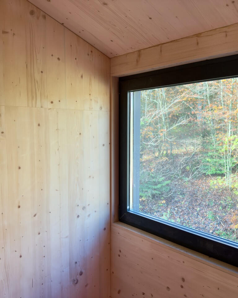 Unutrašnjost kuće izvedena je od punog drva, koje ujedno čini nosivu konstrukciju i završnu površinu zidova i stropova - bez dodatnih obloga, brodskog poda ili letvi. Takav pristup stvara topao, autentičan i vizualno čist prostor, u kojem prirodna tekstura drva daje posebnu atmosferu.Središnji prostor čini otvoreni dnevni dio - kuhinja, blagovaonica i boravak - s visinom od gotovo osam metara i velikim južnim staklenim stijenama koje otvaraju pogled na šumu i unose obilje prirodnog svjetla.Kuća ima dvije spavaće sobe (jednu u prizemlju i drugu na galeriji) te dvije kupaonice i saunu.Tu su i tehnička prostorija, južna natkrivena terasa te sjeverni natkriveni ulaz.Podne obloge čine visokokvalitetna keramika u funkcionalnim prostorima te chevron parket u dnevnim i spavaćim zonama, što prostoru daje profinjen karakter i osjećaj topline.Gradnja ovog tipa iznimno je precizna i tehnički zahtjevna, jer se sve instalacije - od rasvjete, struje i utičnica do vodovoda i prekidača - moraju točno predvidjeti i ugraditi već u fazi proizvodnje CLT elemenata.Svaki detalj je unaprijed planiran, što rezultira besprijekorno izvedenim interijerom koji spaja estetiku, funkcionalnost i vrhunsku izvedbu.